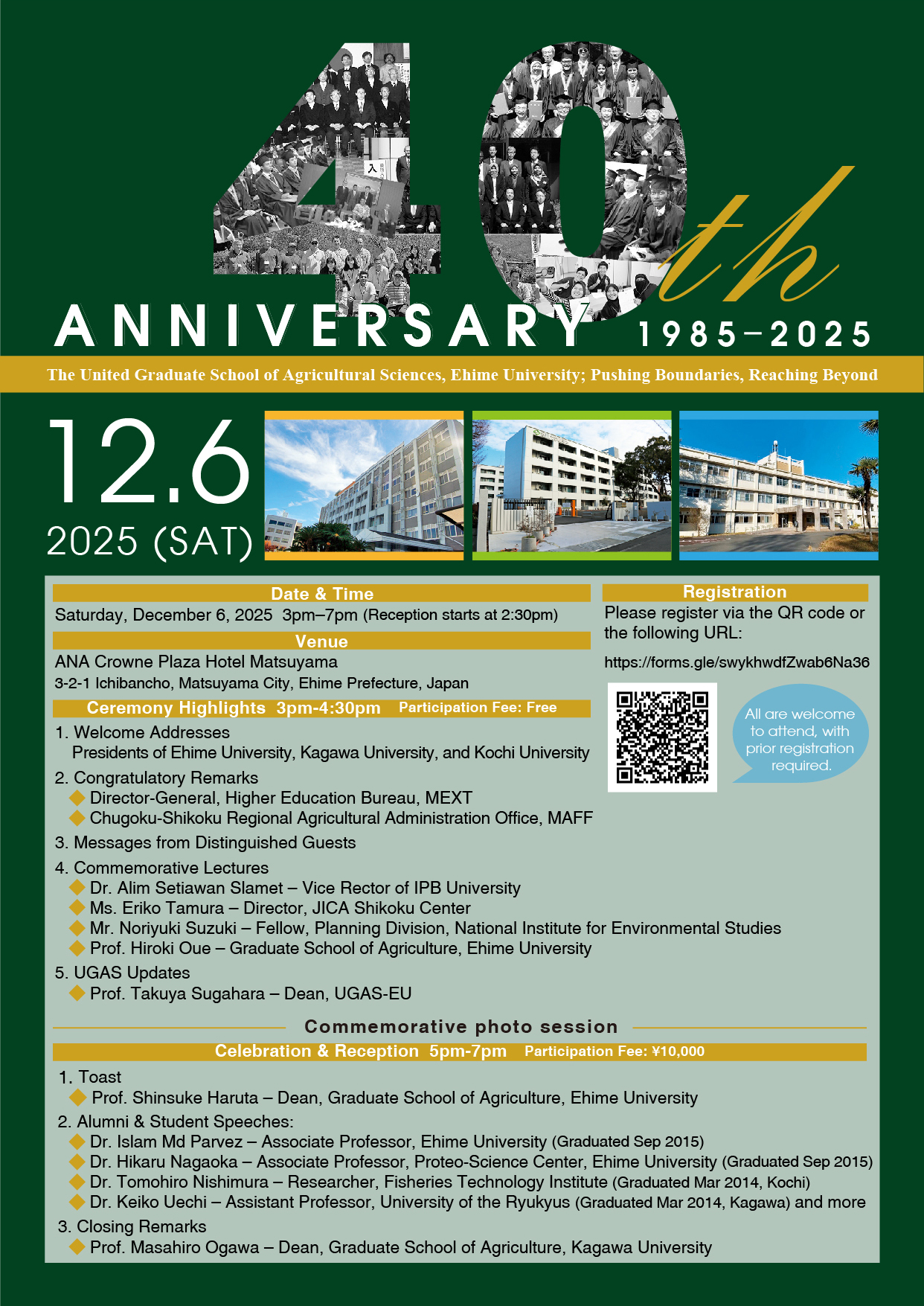 We are delighted to celebrate the 40th anniversary of the United Graduate School of Agricultural Sciences, Ehime University.
