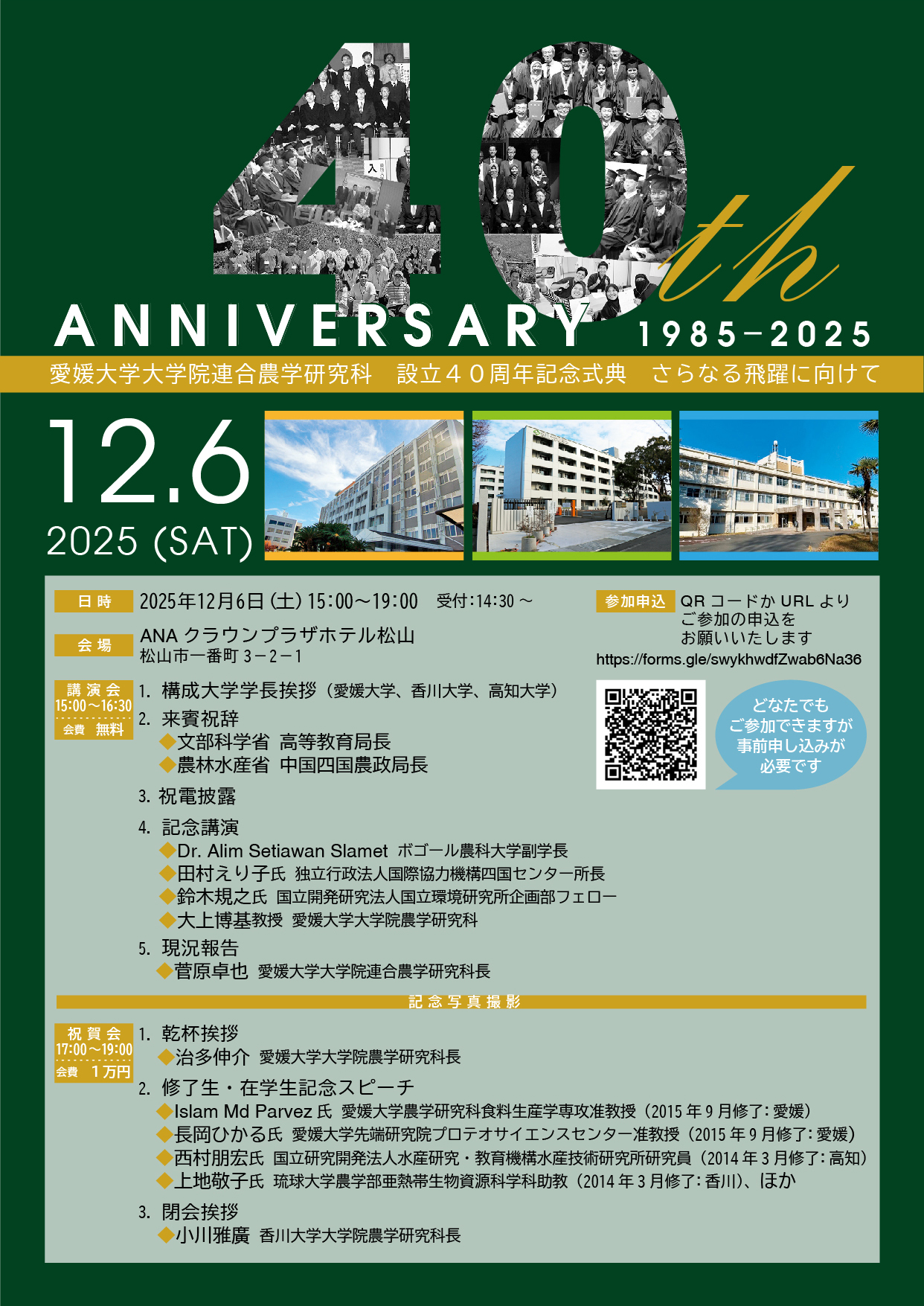 愛媛大学大学院連合農学研究科は、おかげさまで今年度設立40周年を迎えることができました。この度、これを記念し、本研究科のさらなる飛躍に向けて、講演会並びに祝賀会を開催する運びとなりましたので、多数の皆様にご参加いただきたくご案内申し上げます。